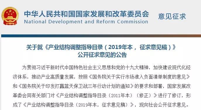 4月8日,國家發(fā)展和改革委員會就《產(chǎn)業(yè)結(jié)構(gòu)調(diào)整指導目錄(2019年本,征求意見稿)》公開征求意見,此次公開征求意見的時間為2019年4月8日至2019年5月7日。
