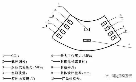 二氧化碳滅火器應(yīng)在瓶體肩部打鋼印。鋼印應(yīng)清晰、排列整齊。鋼印的字體高度為4 mm~10 mm;深度為0.3 mm~0.5 mm;鋼印的字體排列可呈扇面狀排列如圖3,也可在瓶肩部沿圓周線排列,各項(xiàng)目的排列應(yīng)按圖3中指引號(hào)為序。鋼印標(biāo)記應(yīng)有下列內(nèi)容: