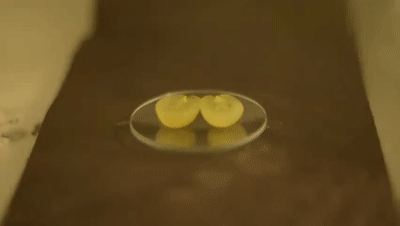 原來(lái)是兩顆葡萄緊挨的位置,在高熱量集中的情況下,會(huì)產(chǎn)生極其強(qiáng)大的電場(chǎng),隨后集中的能量傳遞給葡萄里天然存在的鈉離子鉀離子,于是葡萄就著了。