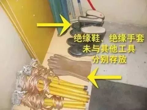 排查依據(jù):DB 11527-2008《變配電室安全管理規(guī)范》5.18.5 絕緣靴、絕緣手套應(yīng)放在密閉的櫥內(nèi),并與其他工具儀表分別存放。