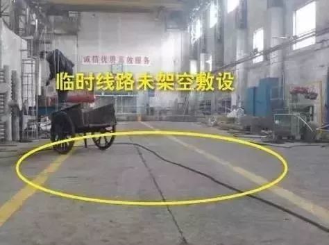 排查依據(jù):《電氣安全管理規(guī)程》(機(jī)械工業(yè)部[86]機(jī)生字 76號)第20條 臨時線路必須采用絕緣良好的導(dǎo)線,應(yīng)用電桿沿墻用合格瓷瓶固定架設(shè),導(dǎo)線距地面的高度室內(nèi)應(yīng)不低于2.5m。