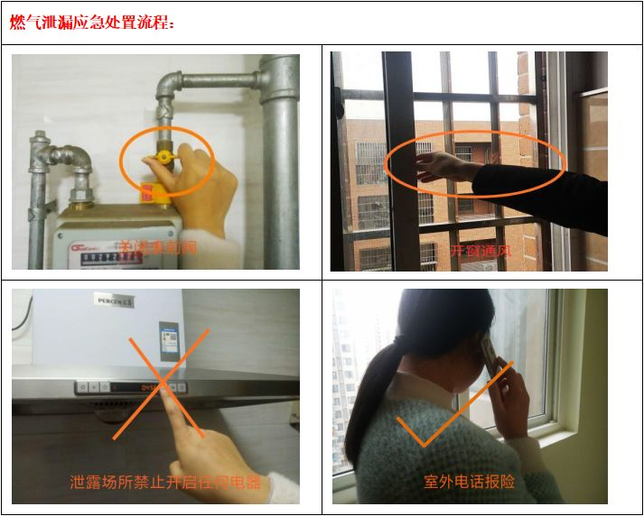 (3)一旦發(fā)現(xiàn)泄漏,首先要穩(wěn)定情緒、不要慌張,應輕手關(guān)閉表前閥或室內(nèi)燃氣總閥,并將門窗打開,過程中嚴禁明火、啟閉任何電器或打電話,然后到戶外安全地點撥打燃氣24小時服務熱線報險。