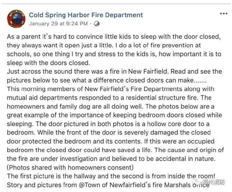 消防員在帖子中說道:關(guān)閉的臥室門在外側(cè)嚴重受到火災(zāi)損傷時,仍能較好地保護臥室內(nèi)的陳設(shè)。