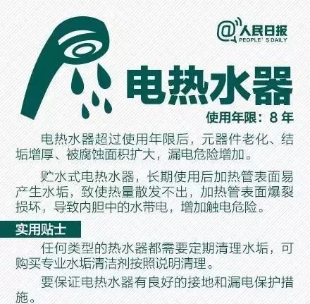 4、電熱水器的使用壽命通常為6-8年,如超過年限還在繼續(xù)使用,就會(huì)存在安全隱患,需要及時(shí)更換。
