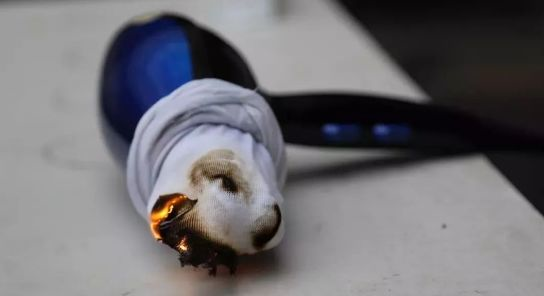 實(shí)驗(yàn)現(xiàn)場,消防人員又將襪子套在吹風(fēng)機(jī)的風(fēng)口上做實(shí)驗(yàn)。當(dāng)吹風(fēng)機(jī)開機(jī)工作后,潮濕的襪子很快就被烘干,但隨后,一股焦味發(fā)出,白色的襪子上出現(xiàn)了幾處黃色焦點(diǎn)。再過一會兒,襪子也起火燃燒了。